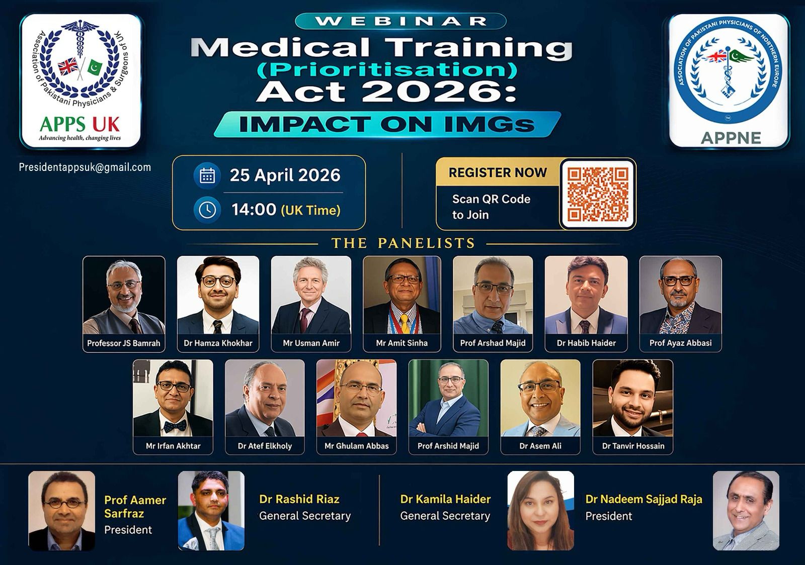 18 April 2026 APPS UK Admin Comments Off on Medical Training (Prioritisation) Act 2026 Date : 25 April 2026 Time: 14:00 (UK Time) THE PANELISTS Professor JS BamrahDr Hamza KhokharMr Usman AmirMr Amit SinhaProf Arshad MajidDr Habib HaiderProf Ayaz AbbasiMr Irfan AkhtarDr Atef ElkholyMr Ghulam AbbasProf Arshid MajidDr Asem AliDr Tanvir Hossain